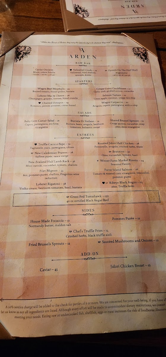 Arden's menu is a celebration of seasonal flavors, emphasizing fresh, high-quality ingredients. Indulge in their RAW BAR offerings, where the Yellowtail Crudo with fried shallots and avocado showcases the bright, delicate flavors of the ocean—this dish is a must-try for any seafood lover at just $19.00. For a more indulgent experience, sample the Caviar Oscietre, beautifully paired with blinis and crème fraiche, a luxurious appetizer sure to impress.